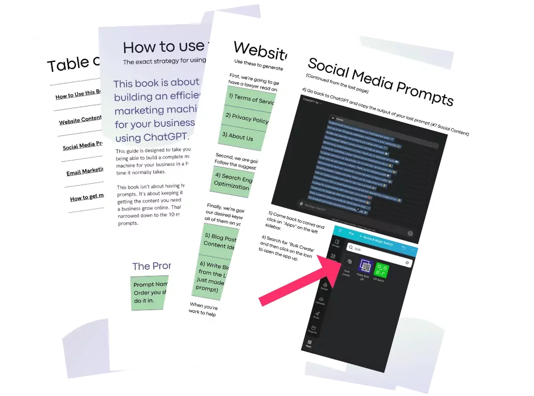 This isn’t a book that will pour AI Prompts all over you. This is a strategic guide that walks you through 10 Chatgpt prompts that will build on to of one another to build a full marketing machine. Use the guide yourself or give it to a staff member and watch as your online marketing starts to finally make sense.